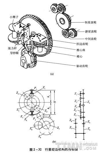 行星絞邊裝置在織機兩側(cè)各安裝一組。傳動側(cè)的一組可以沿筘幅方向調(diào)整安裝位置,以適應(yīng)織物筘幅的變化。行星齒輪絞邊裝置依靠齒輪系傳動筒管座自轉(zhuǎn)與公轉(zhuǎn)。公轉(zhuǎn)的目的是使兩根絞邊紗做開口運動,使緯紗進(jìn)入兩紗之間,同時使兩根絞邊紗像擰繩子一樣與緯紗扭織在一起,從而保持布邊牢固、不脫落。自轉(zhuǎn)與公轉(zhuǎn)方向相反,目的是克服因公轉(zhuǎn)使紗眼位置變化而造成的絞邊紗長度的變化。由于這套裝置是開式傳動,且轉(zhuǎn)速較高,因此該裝置中所有齒輪精度要求都比較高。這套裝置最適合于緯密118~394根/10cm(30~100緯/英寸)范圍內(nèi)的織物。目前多數(shù)噴氣織機采用這種裝置。行星絞邊機構(gòu)的傳動圖見圖2—32。