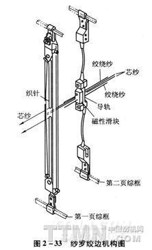 (1)機構(gòu)的概要:這個裝置安裝在第一和第二頁綜框上。利用第一和第二頁綜框的上下運動帶動裝置工作,穿在織針上的兩根芯紗和穿過磁性滑塊上的一對斜長孔中的兩根絞纏紗,共四根紗羅紗進(jìn)行絞邊,如圖2—33所示。