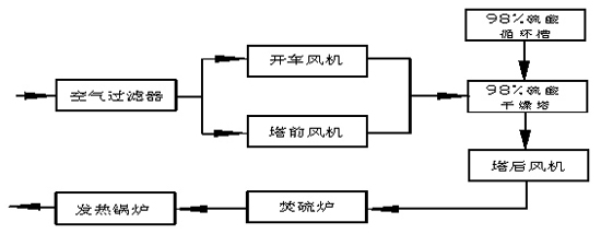 硫磺制酸與礦制酸和冶煉煙氣制酸不同,進(jìn)入主鼓風(fēng)機(jī)的介質(zhì)是空氣而不是含二氧化硫氣體,因此有條件將主鼓風(fēng)機(jī)放在干燥塔之前(即風(fēng)機(jī)處于干燥塔上游),從而對(duì)硫磺制酸來(lái)說(shuō),有風(fēng)機(jī)在塔前、塔后之分。