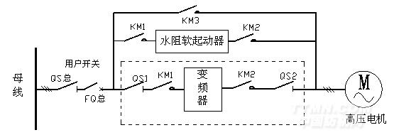 變頻調(diào)速系統(tǒng)由用戶開關(guān)柜、水阻起動(dòng)柜、進(jìn)線柜、CHH100系列高壓變頻器、高壓電機(jī)組成。進(jìn)線柜是由二個(gè)真空接觸器KM1、KM2和兩個(gè)高壓隔離開關(guān)QS1、QS2組成。QS1、QS2用于變頻器維護(hù)過(guò)程中高壓隔離。電機(jī)以變頻方式運(yùn)行時(shí),QS1、QS2和KM1、KM2閉合,水阻起動(dòng)柜不工作。電機(jī)以工頻方式運(yùn)行時(shí),QS1、QS2和KM1、KM2斷開,水阻起動(dòng)柜工作。進(jìn)線柜與和水阻起動(dòng)柜互鎖,完全能夠保證變頻調(diào)速系統(tǒng)安全運(yùn)行。