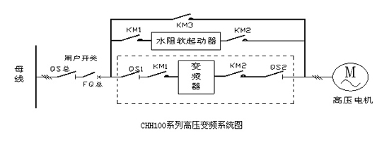 變頻調速系統由用戶開關柜、水阻起動柜、進線柜、CHH100系列高壓變頻器、高壓電機組成。進線柜是由二個真空接觸器KM1、KM2和兩個高壓隔離開關QS1、QS2組成。QS1、QS2用于變頻器維護過程中高壓隔離。電機以變頻方式運行時,QS1、QS2和KM1、KM2閉合,水阻起動柜不工作。電機以工頻方式運行時,QS1、QS2和KM1、KM2斷開,水阻起動柜工作。進線柜與和水阻起動柜互鎖,完全能夠保證變頻調速系統安全運行。