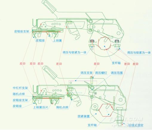 三、搖架中皮輥握持處沒(méi)有上銷簧調(diào)壓片,根據(jù)紡紗工藝的需要有四檔壓力可以選擇。