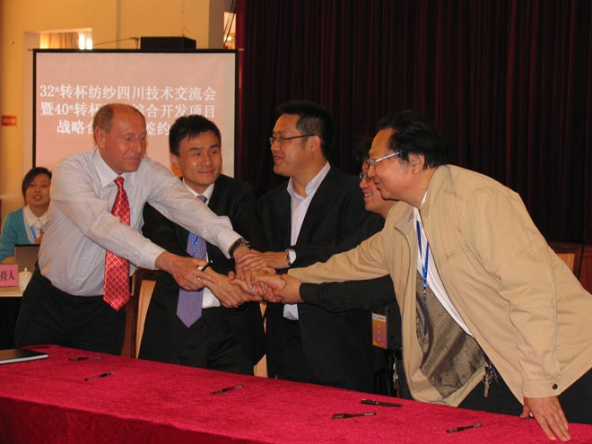 會上由上海淳瑞機械科技有限公司和全國新型紡紗專業(yè)委員會、Elitex International s.r.o.、東華大學紡織工程學院、成都紡織工業(yè)專科學校、四川佐魯銀華紡織有限責任公司簽訂了40S轉(zhuǎn)杯紡紗綜合開發(fā)項目戰(zhàn)略合作協(xié)議。