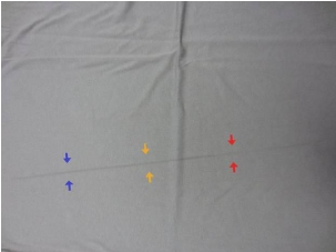 色折痕,又稱行機痕,水痕,直條痕等(見圖一)。主要是因為織物在染機繩狀運行時,經(jīng)向折迭部分長時間沒有換位,造成起折部分顏色比其它部分偏深所致。組織結(jié)構(gòu)比較緊密的平紋布最容易出現(xiàn)此問題。近年來,一方面隨著針織織機技術(shù)的飛速發(fā)展,織物的密度越來越高;另一方面隨著紡紗技術(shù)的發(fā)展,質(zhì)量較差的紗也經(jīng)過提高紡紗捻度等用作織造。這樣前道工序中過多的內(nèi)應(yīng)力帶到后序染整加工來,造成織物收縮不一致,織物在運行中折迭部分不易換位,最終導(dǎo)致色折痕的產(chǎn)生。