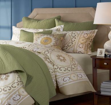 圖1 suzani床品(圖1)是harbor house這一季的新品,它的圖案極具民族特色。“suzani”原意是刺繡,特別是指中亞地區(qū)民間流傳的繡花圖案。從女兒出生那天起,當(dāng)?shù)厝吮汩_始為女兒出嫁準(zhǔn)備繡花蓋被。她們將包含祝福意義的圖案繡于真絲被褥、掛毯、靠墊、衣服等上面,細(xì)看其中如同月亮、太陽、花朵、植物、小刀等各類圖騰,分別代表了財(cái)富、健康、幸福等各類含義。suzani系列將傳統(tǒng)手工藝簡化并融入美式風(fēng)格,讓現(xiàn)代感十足的時(shí)尚紡織品帶上了些許的民族風(fēng)。臥室中放置這樣的一套床品是否無形中感覺自己正承受著神奇的祝福?!