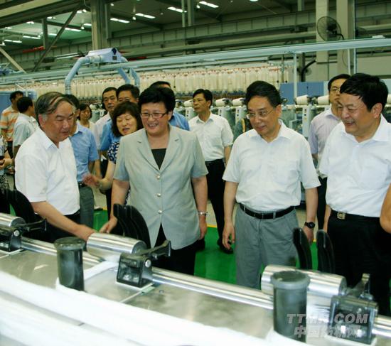 上海寶山區(qū)區(qū)長(zhǎng)汪泓(右三)考察太平洋機(jī)電寶山紡機(jī)制造基地
