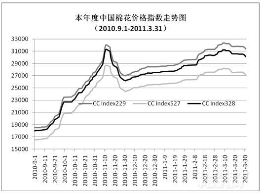 3月國(guó)內(nèi)棉花現(xiàn)貨市場(chǎng)先漲后跌。上旬受?chē)?guó)際價(jià)格、紡織企業(yè)補(bǔ)庫(kù)、棉商惜售等因素影響,持續(xù)小幅上漲;中旬后,日本地震引發(fā)大宗商品市場(chǎng)全面回落,國(guó)內(nèi)外期貨行情大幅波動(dòng)回落,對(duì)現(xiàn)貨市場(chǎng)形成壓力,加之紡織企業(yè)經(jīng)營(yíng)狀況不佳,原料采購(gòu)更趨謹(jǐn)慎,國(guó)內(nèi)棉花價(jià)格不斷下滑,月末已低于月初水平,但月均價(jià)環(huán)比仍上漲近千元。其中CCIndex328級(jí)月均價(jià)30733元/噸,較2月上漲938元/噸,漲幅3.1%,較去年同期上漲15172元/噸,漲幅98%;CCIndex229級(jí)月均價(jià)32630元/噸,環(huán)比上漲1211元,同比上漲16467元。CCIndex527級(jí)均價(jià)為27771元/噸,環(huán)比上漲605元,同比上漲13303元。