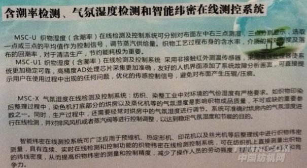 在2013年10月15日中國印染行業(yè)協(xié)會(huì)第五屆理事會(huì)期間。常州宏大展示了其新推出MSC-U織物濕度含潮率在線測控系統(tǒng)、MSC-X氣氛適度在線測控系統(tǒng)、智能緯密在線測控系統(tǒng)。一系列印染自動(dòng)化、智能化、信息化先進(jìn)系統(tǒng)。