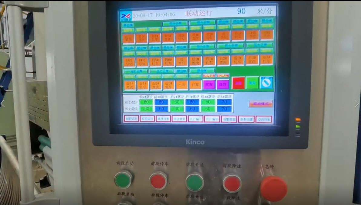 新型平幅前處理張力傳感器設備,今年無錫新聯(lián)印染機電有限公司為杭州中紡研發(fā)制造的新型平幅前處理設備——高速智能數(shù)控煉漂聯(lián)合機。創(chuàng)新的蒸洗箱無傳統(tǒng)松緊架結構,使用張力傳感器,并自助開發(fā)控制程序。做到?jīng)]有氣缸、沒有內(nèi)置軸承等機械結構,可減少維護保養(yǎng),減少故障率,設備運行張力參數(shù)可設定,并且實時顯示(高速運行及升降速過程張力跳動范圍控制在1KG以內(nèi)),用戶使用方便。目前設備已投入實際生產(chǎn)半年多,運行穩(wěn)定,獲得用戶好評。此外還裝備了新型雙層緊式汽蒸箱,極大程度提高了緊式汽蒸的容布量,汽蒸效果更好,同時也裝備了全自動補水系統(tǒng),清水補充了自動根據(jù)車速調整,實時顯示。目前用戶:杭州中紡、航民美時達、浙江錦森、浙江百麗恒、山東信諾