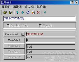 (1)SELECTCOM。SELECTCOM →經(jīng)由此項指令,來選定要切換哪一個通訊端口,因此只要使用此項指令,再于編輯時選擇PLC 為NULL的選項,就可以使用兩個通訊端口了,而0代表COM1,1代表COM2。(切換后,所有的通訊指令將自動針對所切換的通訊端口作處理,不同的宏之間的切換并不會互相支持或是干擾),參見圖1。
