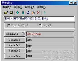 (9)GETCHARS。GETCHARS →經(jīng)由通訊端口得到字符。V1為通訊后回傳的值可經(jīng)由此值,得到這次通訊的結(jié)果,V2為傳輸數(shù)據(jù)的起始地址,V3為數(shù)據(jù)的長度,V4為所允許的最大通訊時間,其單位為千分之一秒,參見圖11。