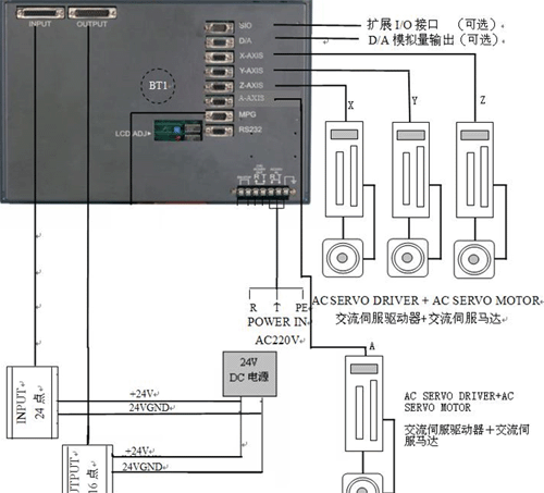 點膠機設(shè)備需要四個軸控制即X、Y(2個)、Z,但是X和Y(2個)要進行插補運行,而插補運行時在G代碼的加工軟件指令中只有X和Y、X和Z、Y和Z,要與CAD等圖形編輯軟件生成的G代碼程序通用就不能使用2個Y軸;因此我們解決的方式是使用中達(dá)電通的四軸數(shù)控系統(tǒng)(PUTNC-H4-4):X軸控制原來的X軸在橫向運動;Y軸控制原來的Y1軸,同橫向的X軸進行插補控制第一個點膠平臺;Z軸控制原來的Y2軸,同橫向的X軸進行插補控制第二個點膠平臺;A軸控制原來的Z軸走不同高度的點膠面;這樣就可以解決控制系統(tǒng)能直接執(zhí)行CAD等圖形編輯軟件生成的代碼程序;中達(dá)的數(shù)控系統(tǒng)本身具有24個輸入點、16個輸出點,設(shè)備的I/O點也夠使用;中達(dá)的A系列伺服使用的控制理論是最先進的強健式的控制理論(PDFF),即使在伺服電機的負(fù)載慣量大范圍的變化時,伺服系統(tǒng)仍然可以保持優(yōu)異的性能,進行流暢、精準(zhǔn)、正確地定位。通過客戶的技術(shù)要求和原控制方案的不足我們選擇了基于中達(dá)電通的數(shù)控系統(tǒng)的控制方案,系統(tǒng)由數(shù)控系統(tǒng)、伺服控制系統(tǒng)、執(zhí)行機構(gòu)組成控制方案,參見圖1。系統(tǒng)電氣接線參見圖2。電控柜圖片參見圖3。