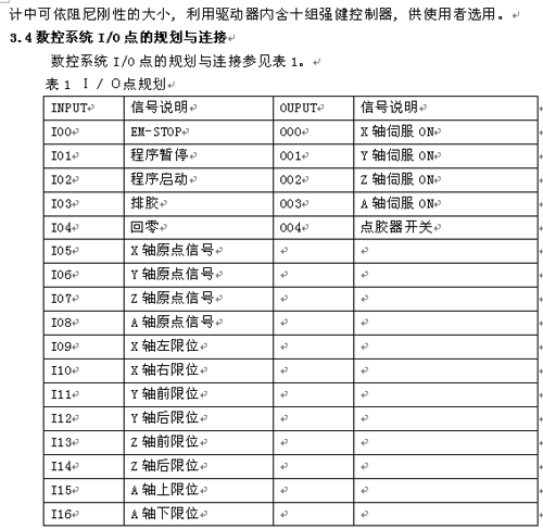 數(shù)控系統(tǒng)控制的點膠機設(shè)備共有四個軸,使用四臺伺服控制器和伺服電機,X軸一臺、Y軸兩臺、Z軸一臺;輸入信號有急停按鈕、手動自動轉(zhuǎn)換按鈕、手動點膠按鈕、暫停按鈕、回零按鈕、左右限位輸入信號及伺服報警信號等共計21個輸入信號;控制流程是使用數(shù)控系統(tǒng)控制四個伺服控制器及伺服電機、四個點膠器的開關(guān)信號,自動運行時Y軸控制的兩個平臺交替工作,X軸和兩個Y軸需要走直線插補或圓弧插補,Z軸需要走不同高度的點膠面,更換產(chǎn)品比較頻繁,更換產(chǎn)品后需手動調(diào)整開膠點,然后在進行單步動作或自動運行;功能與特點:1.所有軸上均采用了滾珠絲杠和伺服電機,可以確保用戶能夠流暢、精準(zhǔn)、正確地點膠;2.點膠準(zhǔn)確、均勻;3.注膠量、點膠速度可任意調(diào)節(jié);4.LED中文菜單顯示;5.輕觸式按鍵操作;6.控制簡單、方便、直觀。