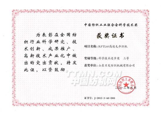11月29日,中國(guó)紡織工業(yè)聯(lián)合會(huì)科技進(jìn)步獎(jiǎng)?lì)C獎(jiǎng)大會(huì)在人民大會(huì)堂隆重召開(kāi),公司總工程師李子軍先生參加了頒獎(jiǎng)典禮。公司的RFTL60型高速毛巾織機(jī)榮獲中國(guó)紡織工業(yè)聯(lián)合會(huì)科技進(jìn)步三等獎(jiǎng)。本獎(jiǎng)項(xiàng)的獲得充分肯定了公司該產(chǎn)品的科技含量以及市場(chǎng)價(jià)值。