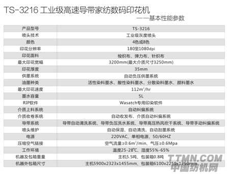 TS3216工業(yè)級(jí)高速導(dǎo)帶家紡數(shù)碼印花機(jī)的基本性能參數(shù)
