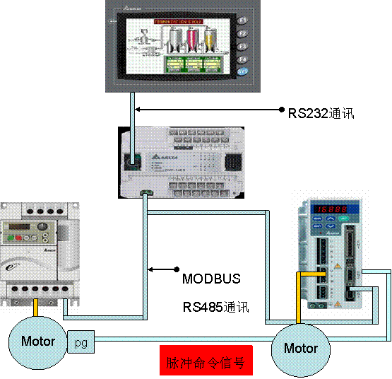 本機(jī)主傳動(dòng)即一羅拉采用臺(tái)達(dá)VFD055E43A型變頻器驅(qū)動(dòng)變頻電機(jī),通過(guò)臺(tái)達(dá)ES3-06CG6941型光學(xué)編碼器將轉(zhuǎn)速信號(hào)送到后級(jí)臺(tái)達(dá)ASDA1521MA型伺服驅(qū)動(dòng)裝置,由伺服電機(jī)驅(qū)動(dòng)二三羅拉運(yùn)行,其中伺服接受編碼器脈沖信號(hào)由PLC依據(jù)標(biāo)準(zhǔn)定量與檢測(cè)定量的差值運(yùn)算結(jié)果后通過(guò)MODBUS總線方式發(fā)出指令改變伺服電子齒輪比,從而達(dá)到動(dòng)態(tài)改變牽伸比的目的,直到檢測(cè)定量符合國(guó)標(biāo)工藝要求。