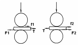 設(shè)前、后羅拉作對(duì)須條的摩擦力F1、F2,前、后皮輥對(duì)須條的摩擦力f1、f2;牽伸力為T,如圖所示: