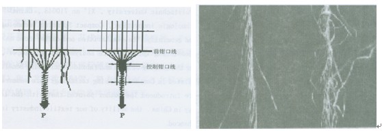 緊密紡紗技術(shù)是環(huán)錠紡紗的重要技術(shù)進(jìn)步,使環(huán)錠細(xì)紗機(jī)換發(fā)了青春,在 2007幕尼黑ITMA上展出的環(huán)錠細(xì)紗機(jī)幾乎全部都是緊密紡環(huán)錠細(xì)紗機(jī)。可見(jiàn)發(fā)展緊密紡紗技術(shù)是很有潛力與市場(chǎng)前途的。許多機(jī)械制造公司都在開(kāi)發(fā)緊密紡紗技術(shù),國(guó)外有立達(dá)、緒森、青澤、豐田等公司在生產(chǎn)緊密紡紗機(jī)供應(yīng)市場(chǎng).國(guó)內(nèi)有華方、同和、德昌、馬佐里-東臺(tái)、松寶等公司生產(chǎn)緊密紡專(zhuān)件供應(yīng)細(xì)紗機(jī)改裝成緊密紡紗機(jī),而且已銷(xiāo)往國(guó)外改裝。我國(guó)二紡機(jī)與緒森公司合作生產(chǎn)整臺(tái)密紡紗機(jī)供應(yīng)市場(chǎng)。10多年來(lái)的產(chǎn)實(shí)踐表明緊密紡紗的質(zhì)量不論紗的強(qiáng)力、斷裂伸長(zhǎng)、毛羽及紗疵等都比普通環(huán)錠紡紗的質(zhì)量好的多。圖1所示緊密紡紗技術(shù)紡紗三角區(qū),在負(fù)壓氣流的控制下短纖維受控分布于紗線結(jié)構(gòu)中,使成紗毛羽減少。圖2為緊密環(huán)錠紗與普通環(huán)錠紗的毛羽情況的對(duì)比。