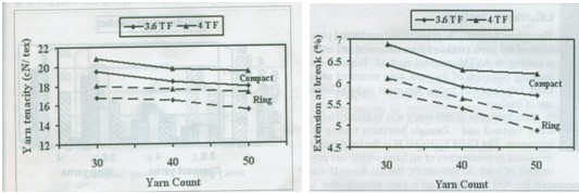 統(tǒng)計(jì)分析還表明紡紗方法對(duì)紗線的強(qiáng)力有很大的影響,緊密紡紗的強(qiáng)力平均值要比普通環(huán)錠紗的強(qiáng)力平均值高17%。如果緊密紗的拈系數(shù)高及紗線支數(shù)較低,則緊密紗的強(qiáng)力平均值較高。如30英支緊密紗的拈系數(shù)在4時(shí)強(qiáng)力平均值較高,反之50英支普通環(huán)錠紗的拈系數(shù)在3.6時(shí)強(qiáng)力平均值較低。