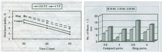 一般紗的毛羽特征以毛羽值H表示 ,是應(yīng)用烏斯特-3(或?yàn)跛固?4、烏斯特-5)檢測(cè)1公分長(zhǎng)度上紗線上毛羽數(shù)。ZweigleS3是用來(lái)檢測(cè)毛羽長(zhǎng)度的分布。根據(jù)統(tǒng)計(jì)分析:紡紗方法、拈系數(shù)及紗支對(duì)生產(chǎn)的紗線的毛羽有顯著的影響。緊密環(huán)錠紗及普通環(huán)錠紗相比較見(jiàn)圖5 及圖6。紡紗方法(緊密環(huán)錠紡及普通環(huán)錠紡)對(duì)紗線的毛羽有顯著的影響。圖5 所示被測(cè)緊密紗的全部毛羽長(zhǎng)度要比同支普通環(huán)錠紗減少26% ,這個(gè)結(jié)論是被測(cè)紗支較低 、拈系數(shù)較高的條件下得到的 。普通環(huán)錠紗上凸出的纖維數(shù)要比緊密環(huán)錠紗多也長(zhǎng)的多,表明緊密環(huán)錠紡對(duì)纖維的聚集作用對(duì)纖維的有效的控制。與普通環(huán)錠紗相比較 3毫米及以上的毛羽,緊密環(huán)錠紡可減少 31%。