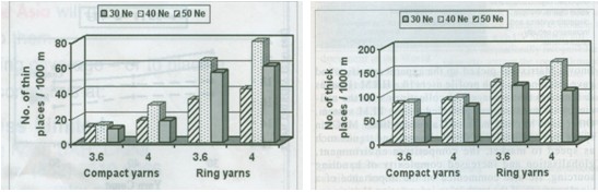 按2007烏斯特統(tǒng)資料規(guī)定,紗的任何布分如果粗于原紗直徑+35這部分即稱(chēng)為粗節(jié),粗節(jié)對(duì)產(chǎn)品質(zhì)量及生產(chǎn)效率有負(fù)面影響。粗節(jié)的檢測(cè)是每1000米長(zhǎng)的紗上粗節(jié)數(shù)的平均值。紡紗方法、紗支及拈系數(shù)等因素都會(huì)對(duì)粗節(jié)的產(chǎn)生有影響,特別是拈系數(shù)對(duì)粗節(jié)的產(chǎn)生有顯著的影響。不論是緊密紡還是普通環(huán)錠紡拈系數(shù)對(duì)粗節(jié)的產(chǎn)生的影響最大。40英支紗粗節(jié)較多、30英支紗及50英支紗依次次之。紗支高,拈系數(shù)低的條件下粗節(jié)數(shù)多。緊密紡紗要比普通環(huán)錠紗的粗節(jié)數(shù)少54%。
