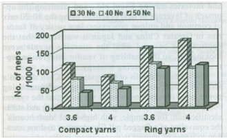 棉結(jié)大于正常棉紗直徑的+140%,以每1000米紗上的棉結(jié)數(shù)考核。對(duì)紗線及機(jī)器的性能進(jìn)行分析,紡紗方法及紗支對(duì)棉結(jié)的產(chǎn)生及棉結(jié)的多少有顯著的影響。緊密紡紗的棉結(jié)要比普通環(huán)錠紗的棉結(jié)數(shù)少28-61%,不同的紗支,不同的拈系數(shù)的結(jié)數(shù)不同,純棉低支紗及低拈系數(shù)時(shí)棉結(jié)數(shù)多。