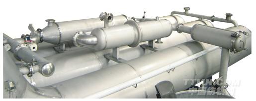 又由于鍋爐與筒狀體間構成一個閉合的循環(huán)油路,利用循環(huán)的導熱油對流經換熱管內的染色進行加熱。在加熱過程中,除設備本身的熱傳遞外,再無其它損耗,并且導熱油可循環(huán)、反復使用,不會損耗,使得其利用率接近100%,克服了采用蒸氣加熱對水資源的浪費。