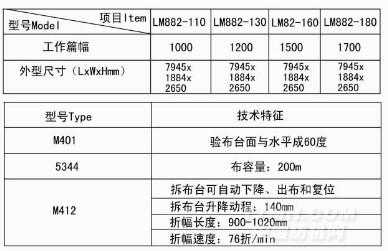 本聯(lián)合機(jī)用于棉織及印染廠,做檢驗(yàn)及折疊布匹用。該機(jī)由M401型驗(yàn)布機(jī)、5344型容布箱和M412型折布機(jī)三部分組成。