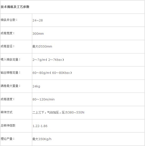 本機將經過預并后的棉條并合、牽伸,形成棉層,并卷繞成一定規(guī)格、重量及密度的棉卷,供精梳機使用。