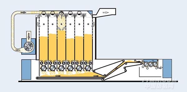 棉箱混棉機(jī)最初用在紡紗廠的前紡工序是為了實(shí)現(xiàn)特定的、可重復(fù)進(jìn)行的原料混合。棉箱同時被依次填滿和排空,以達(dá)得最佳的混合均勻性。根據(jù)實(shí)際應(yīng)用情況,可選擇6棉箱或10棉箱。如果對混合的要求還要高,可串連使用兩臺混棉機(jī)(串連混棉)。