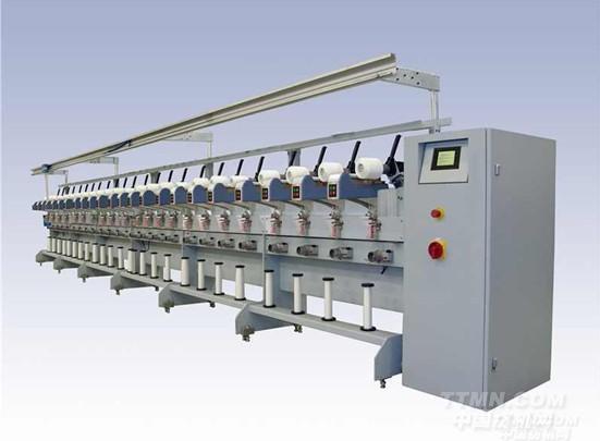 該機用于任何種類的紗線,采用精密卷繞,導紗方式采用單錠電機通過齒形帶 傳動筒管卷繞,單錠微型電機通過齒形帶驅(qū)動導紗器導紗。每錠帶有電機驅(qū)動的絞紗棚架、超喂輪; 帶有上蠟裝置和張力傳感器,導紗動程 6in、8in,卷繞速度800m/min。
