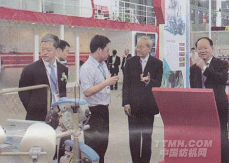 ●中國(guó)紡織工業(yè)聯(lián)合會(huì)名譽(yù)會(huì)長(zhǎng)杜鈺洲(右二)和中國(guó)紡織工業(yè)聯(lián)合會(huì)副會(huì)長(zhǎng)高勇 (右一)、夏令敏(左一)等領(lǐng)導(dǎo)在泰坦展位參觀。