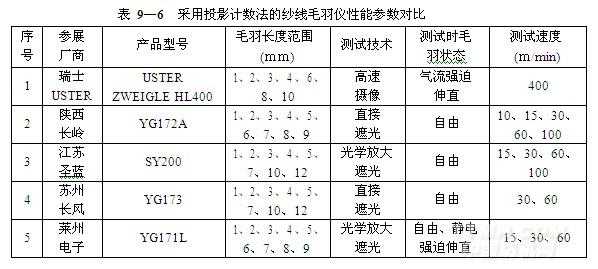 (3)采用投影計數(shù)法的紗線毛羽儀性能參數(shù)對比 (表 9—6)