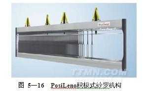 a.采用 Groz-Beckert公司新推出的 PosiLeno®積極式控制紗羅系統(tǒng),通過綜框運(yùn)動帶動全幅紗羅 (圖 5—16)。過去消極式紗羅織造機(jī)構(gòu)將紗羅綜片安裝在綜框上,由綜框傳動、彈簧回綜,結(jié)構(gòu)簡單、運(yùn)動時(shí)沖擊大 (圖 5—17),只能適應(yīng)較低的織造速度。新型的 PosiLeno積極式紗羅機(jī)構(gòu)將紗羅綜片安裝在 1片綜框上,另一片綜框通過鉸接的連桿傳動紗羅綜片。這種結(jié)構(gòu)適應(yīng)更高的織造速度,生產(chǎn)效率成倍提高,為劍桿織機(jī)織造紗羅織物提供了簡單易用的方案;