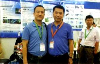 圖為江陰長紡科技有限公司董事長徐正堅(jiān)(左一)和河南天星紡織有限公司董事長張勇在展位前合影。