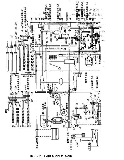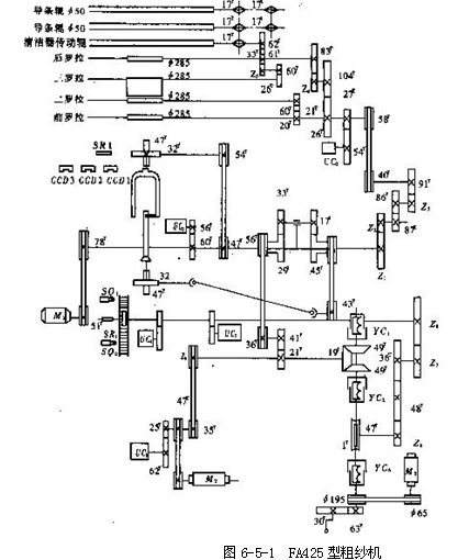 ⒉粗紗機(jī)的傳動(dòng)系統(tǒng)  粗紗機(jī)的傳動(dòng)系統(tǒng)因機(jī)型而異,現(xiàn)以由機(jī)電化向智能化的過(guò)渡機(jī)型——FA425型粗紗機(jī)為例,其傳動(dòng)系統(tǒng)如圖6-5-1所示。