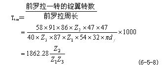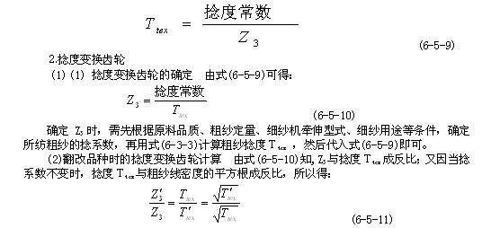 (1)總牽伸變換齒輪Z4  Z4與總牽伸倍數(shù)E成反比,欲求Z4時(shí),先根據(jù)喂入棉條定量及擬紡粗紗定量,計(jì)算出所需的實(shí)際牽伸倍數(shù),再用配合率求出機(jī)械牽伸倍數(shù)E,然后代入式(6-5-4 ) 中即可。在熟條定量不變的情況下,翻改紗特時(shí),可按下式計(jì)算Z4: