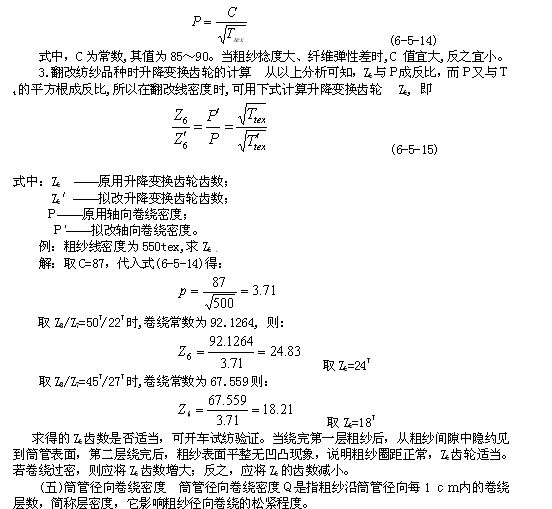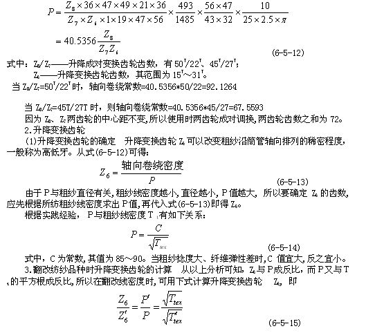 (3)升降齒輪  升降齒輪用于調(diào)節(jié)粗紗在筒管軸向排列的疏密程度,改變升降齒輪的齒數(shù),即改變了升降龍筋的升降速度和粗紗的卷繞圈距。