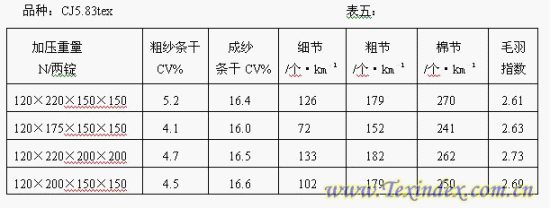 在滿足握持力大于牽伸力的情況下,粗紗機(jī)的羅拉加壓主要根據(jù)牽伸形式、羅拉速度、羅拉握持距、牽伸倍數(shù)、熟條定量及膠輥狀態(tài)而定,羅拉速度慢,隔距大,定量輕、膠輥硬度低、彈性好時(shí)加壓輕,反之則重。牽伸區(qū)有集合器重加壓,主牽伸區(qū)無(wú)集合器的四上四下D型牽伸羅拉加壓可略輕。結(jié)合緒森板簧搖架的性能,確定四種加壓分配進(jìn)行試驗(yàn)優(yōu)選,結(jié)果見(jiàn)表五: