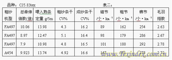 為了合理優(yōu)選出最佳粗紗工藝參數(shù),以提高CJ5.83tex成紗質(zhì)量。我們根據(jù)確定的試驗(yàn)條件,對(duì)FA497粗紗的總牽伸倍數(shù)、主牽伸區(qū)和后區(qū)的羅拉隔距、后區(qū)牽伸倍數(shù)、加壓重量及鉗口隔距進(jìn)行工藝優(yōu)選試驗(yàn).