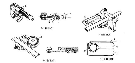 邊撐的形式主要有刺環(huán)式、刺輥式、刺盤式和全幅邊撐等幾種,如圖10-7所示。其中以刺環(huán)式應(yīng)用最多。