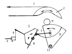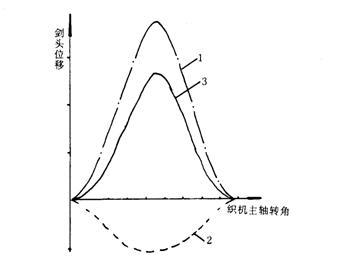 1-僅由引緯連桿機(jī)構(gòu)運(yùn)動引起的劍桿位移? 2-僅由筘座運(yùn)動引起的劍桿位移