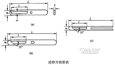經(jīng)停片是織機(jī)經(jīng)停裝置的傳感元件,當(dāng)經(jīng)紗斷頭時(shí),經(jīng)停片下落,通過機(jī)械檢測機(jī)構(gòu)或電氣檢測機(jī)構(gòu),發(fā)動(dòng)織機(jī)迅速停車。經(jīng)停片由鋼片制成,外形如下頁圖所示,圖中(a)為機(jī)械式經(jīng)停裝置的經(jīng)停片,(b)、(c)為電氣式經(jīng)停裝置的經(jīng)停片。