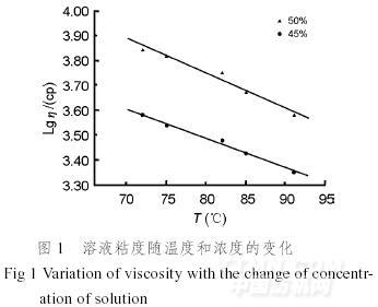 由圖1~2可知,本實(shí)驗(yàn)所配制的紡絲溶液,其粘度隨濃度的增加而增加,隨溫度和表面活性劑加入量的增加而降低。這是因?yàn)殡S著溶液濃度的增加,蛋白質(zhì)大分子間的作用力和瞬間網(wǎng)絡(luò)結(jié)構(gòu)增加,使得溶液粘度增加。當(dāng)溫度上升或表面活性劑用量增加時,大分子鏈段的活動能力變大,分子間力減弱,瞬間網(wǎng)絡(luò)結(jié)構(gòu)被破壞而導(dǎo)致粘度下降。而且隨著溶液濃度的提高,其粘流活化能增大,粘度受溫度的影響也就越顯著。表明該溶液符合一般高聚物溶液的基本特性和Arrhenius方程式η=A·expEη/RT所表征的規(guī)律。式中A為由聚合物種類、分子量、鏈剛性決定的常數(shù),Eη為粘流活化能,T為絕對溫度,R為氣體常數(shù)[7]。
