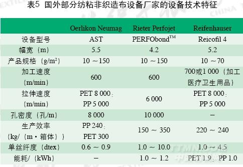 RieterPerfojet公司的PERFObondTM紡粘非織造布生產(chǎn)線可在低能耗、靈活工藝配置下生產(chǎn)出高品質(zhì)產(chǎn)品,單絲直徑10~40ìm,MD/CD接近1。在PET紡絲成網(wǎng)中,紡絲速度達5000~6000m/min,每24h斷絲最多不得超過1次。在高品質(zhì)、低能耗條件下,提高生產(chǎn)效率是人們關注的重要方面。如OerlikonNeumag公司的AST型生產(chǎn)線在紡制PET產(chǎn)品時,最多可提供3組箱體,拉伸速度8000m/min,生產(chǎn)線速度600m/min,噴絲板孔密度8000孔/m。而它提供給意大利Albis公司的紡粘非織造布生產(chǎn)線是世界上幅寬最大的紡粘生產(chǎn)線,達7m。表5是幾種具有代表性的紡粘設備的性能。