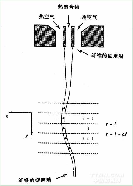 1990年,shambaugh等人建立了"非等溫性、非牛頓性流體"熔噴數(shù)學(xué)模型,但該熔噴數(shù)學(xué)模型局限于較低的熔噴牽伸速度,即熔噴纖維不會發(fā)生嚴(yán)重的振動情況。熔噴模頭下2cm處紡絲線25次曝光的頻閃照片,顯示熔噴纖維垂直于紡絲線的運(yùn)動是非常明顯的。