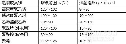 從熱熔膠的熔融得知,熱熔膠的熔點范圍和熔融指數(shù)是熱熔粘合過程中兩個非常重要的參數(shù),它將直接影響粘條件和效果。為此,將襯布常用的熱熔膠的熔融范圍和熔融指數(shù)列表如下,在熔融粘合前須先了解襯布屬于哪一種熱熔膠,并知道其兩個主要熱性能參數(shù)。