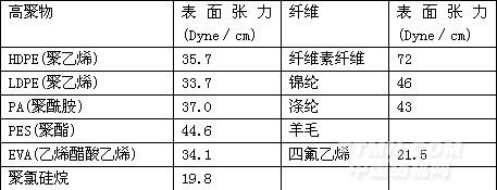 粘合的最佳潤濕條件是γs≌γL,若γL>γs潤濕就不易進行,表2是各種纖維和熱熔膠的表張力。