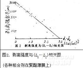 δ1和為δ2為兩種粘合高聚物的溶解度參數(shù),(δ1-δ2)可表示兩種高聚物的相容性,兩種物質(zhì)的溶解度參數(shù)越接近,則相容性越好。在P和q為常數(shù)的前提下,粘合強(qiáng)度隨相容性的增加而增加。如用log剝離強(qiáng)度對(duì)(δ1-δ2)作圖可得一直線。