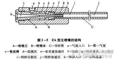 新型噴氣織機(jī)為了實現(xiàn)高速時的穩(wěn)定引緯,加裝了輔助主噴嘴,輔助主噴嘴與主噴嘴構(gòu)成串聯(lián)組合關(guān)系,可以縮短緯紗加速時間,從而為噴氣織機(jī)提高運行速度或拓寬筘幅創(chuàng)造了條件。2A型主噴嘴的結(jié)構(gòu)見圖2—5。